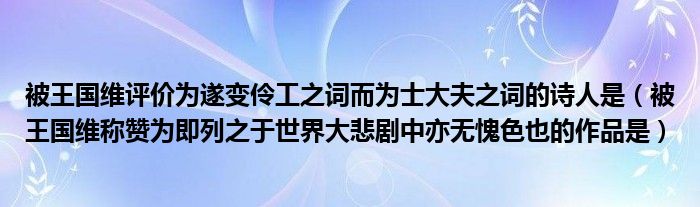 今天菲菲来为大家解答以上的问题。被王国维评价为遂变伶工之词而为士大夫之词的诗人是,被王国维称赞为即列之于世界大悲剧中亦无愧色也的作品是相信很多小伙伴还不知道,现在让我们一起来看看吧!